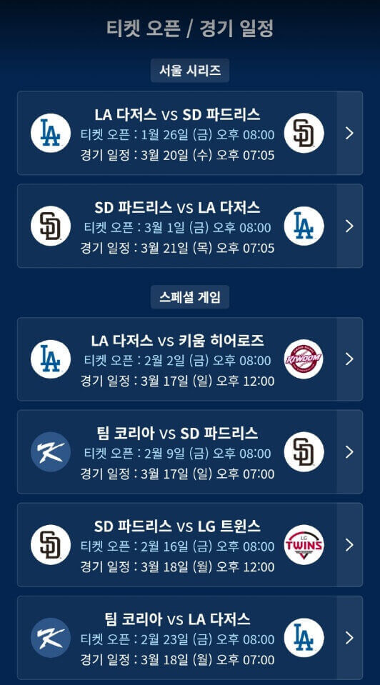 사상 최초로 한국에서 메이저 리그 정규 시즌 경기가 열리게 되었습니다. 2024년 MLB 시즌 개막전, LA 다저스 vs 샌디에이고의 개막 2연전, LG, 키움, 팀 코리아와의 스페셜 게임까지 총 6경기가 열립니다. 예매는 모두 쿠팡플레이에서 가능합니다. 예매 가격은 아직 공개되지 않았습니다.