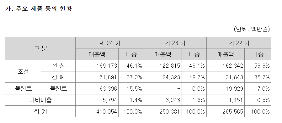플랜트 모듈 등을 생산하고 있으며, 플랜트 부분의 매출은 크지는 않지만 이를 기반으로 최근 해상풍력에도 진출하고 있습니다.
